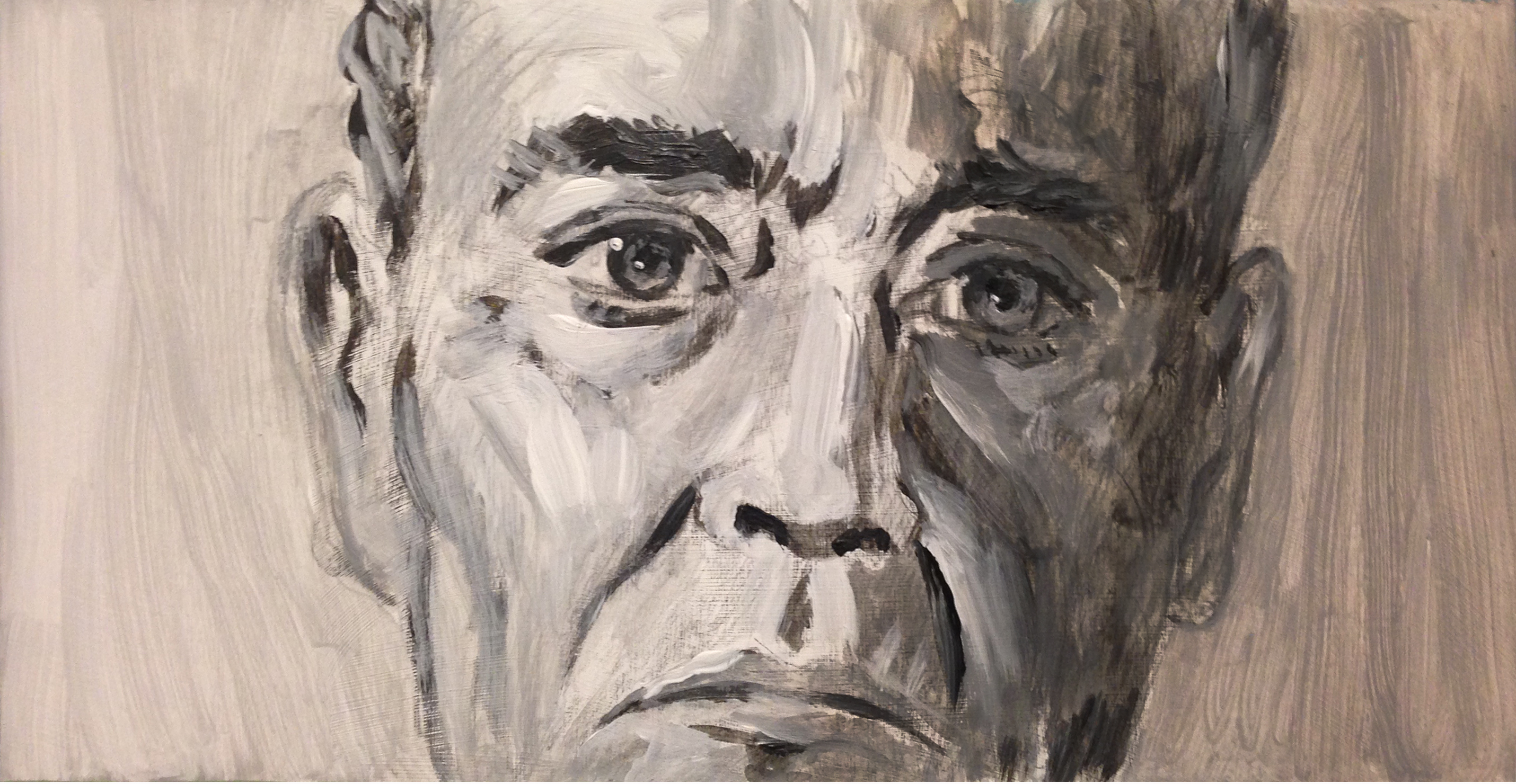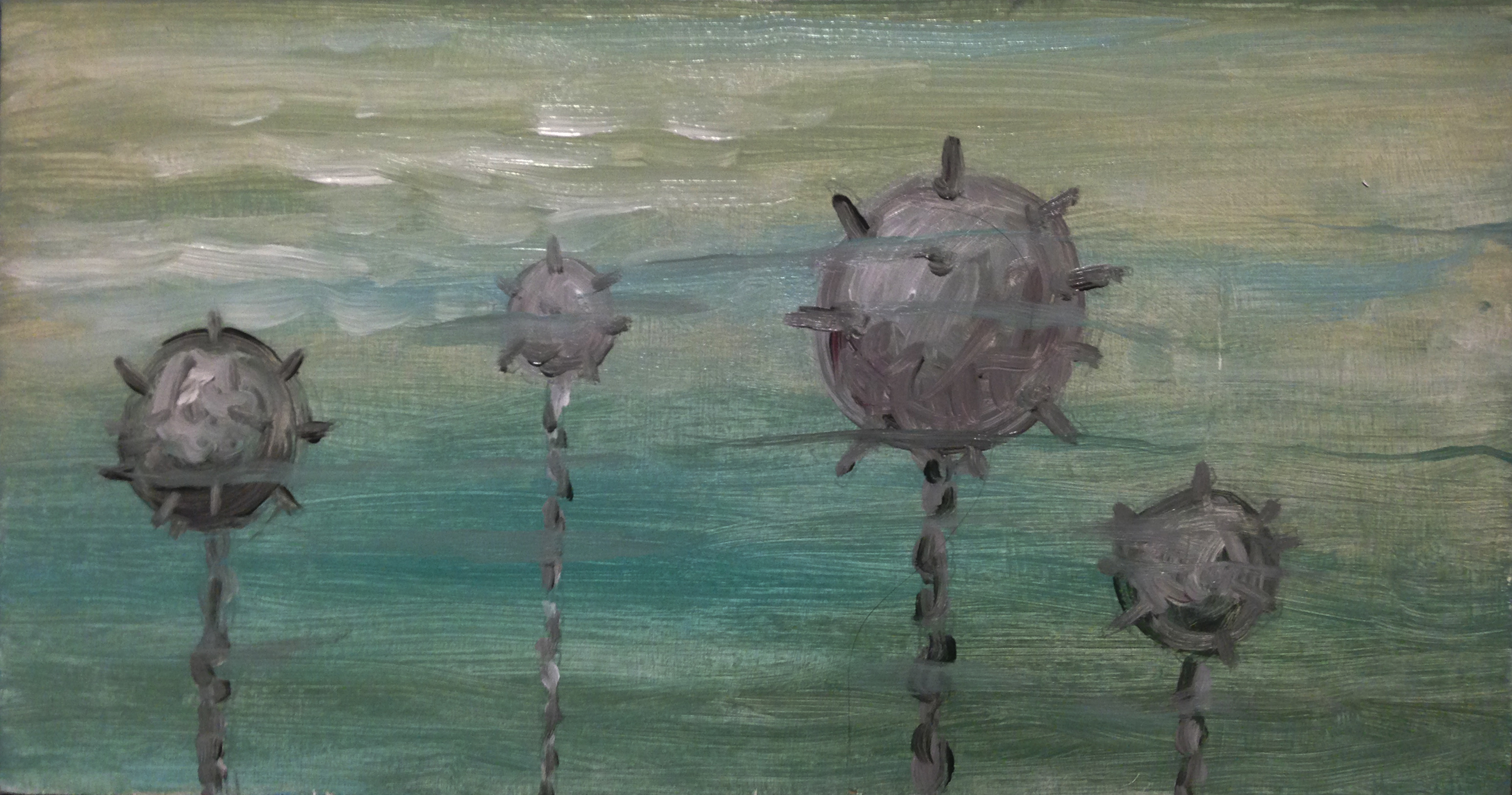 As with her portraits, the agitated energy of Linda Ganus Albulescu’s fluent brushwork adds further tension to related paintings such as “Mantabot,” depicting an underwater drone resembling a robotic shark currently being developed by the U.S. Navy, and “Mines,” explosives with chains attached to spike-studded steel balls that resemble 21st-century mass destructive updates of the medieval mace.